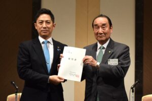 大森会長(右)から要望書を受け取る鈴木知事(左)
