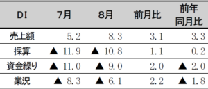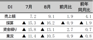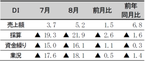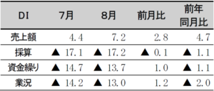 サービス業は、売上額・資金繰り・業況DIが小幅に上昇、採算DIはわずかに上昇した。継続するインバウンド需要に季節行事等が重なり、サービス業全体で5ヶ月ぶりに全DIが上昇。特に旅館業は、4ヶ月月ぶりに業況DIがプラス値となった。反面、原材料価格等の高止まりは継続しており、旅館や理・美容関連では、猛暑による電気コスト増に苦しむ声も散見された。外部環境に依存しない持続可能な収益構造の構築が急務である。
