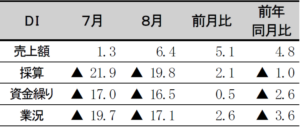 8月期の産業全体の景況は、売上額DIが小幅に上昇、資金繰り・業況DIはわずかに上昇し、採算DIは不変だった。資金繰り・業況DIは5月期から4ヶ月連続で上昇。コスト高や人手不足に苦しむ小規模事業者が多い中、最低賃金額改定目安が公表され、さらなる人件費の上昇を懸念する声が散見されたことにより、産業全体としては緩やかな回復に留まった。
